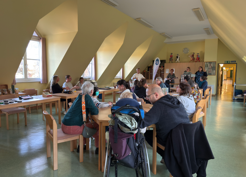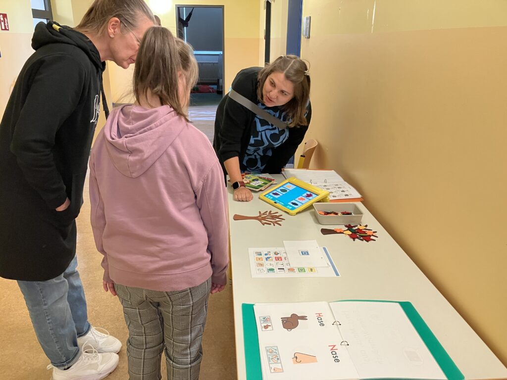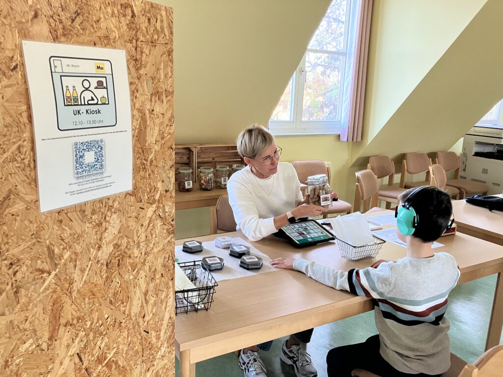 Einige Familien nutzen das Angebot des UK-Cafés am 5.11.2025. Nach einer kleinen musikalischen Begrüßung mit dem Lied „Hallo liebe Leute“ konnte mit Symbolkarten und mit dem elektronischen Kommunikationsgerät ein Stück Kuchen oder ein Getränk bestellt werden. Die Eltern erhielten Einblick in unseren UK-Kiosk, in verschiedene Möglichkeiten der Tastenschaltung und die Nutzung der Gotalk Now App. In gemütlicher Runde gab es viel Zeit für den gemeinsamen Austausch. Vielen Dank an die vielen Helfer.