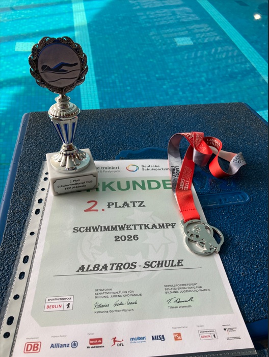 Nach spannenden Staffelläufen und einer großen Aufholjagd können wir unserer Schwimmmannschaft zu einem tollen 2. Platz herzlich gratulieren. Leider fehlten am Ende 4 Sekunden zum Sieg. Frau Lüdicke startete zu dem als einzige Frau gegen sechs Männer beim Lehrerwettbewerb.